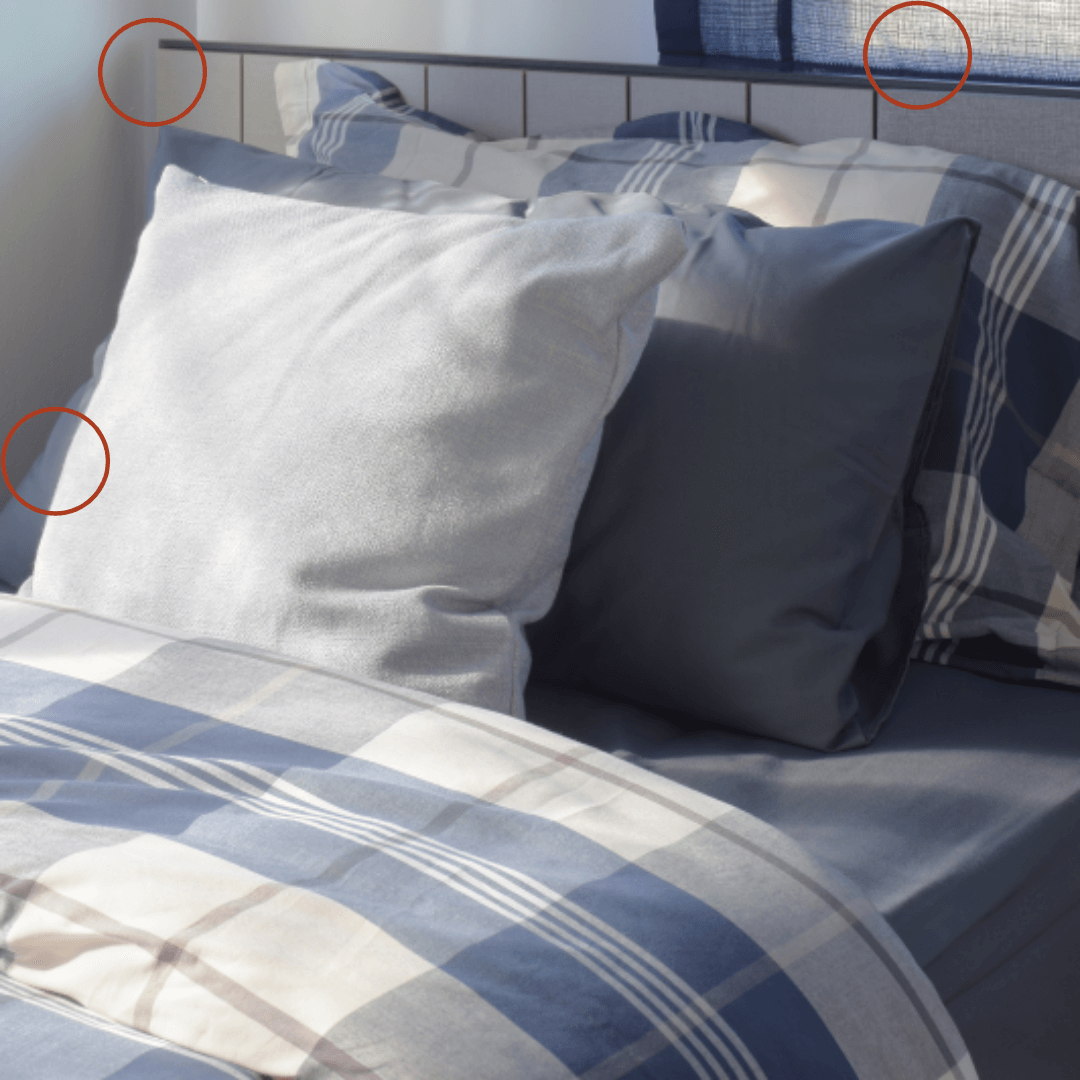 침대의 매트리스 패드를 들어 올리고 침대 모서리나 커버의 주름진 곳을 살펴보는 것이 중요합니다. 적갈색의 빈대 배설물이나 빈대가 눌러져 죽으면서 묻힌 혈흔 또는 알껍질(난각)이나 탈피 허물 등을 찾았다면 빈대가 있다는 의미입니다.