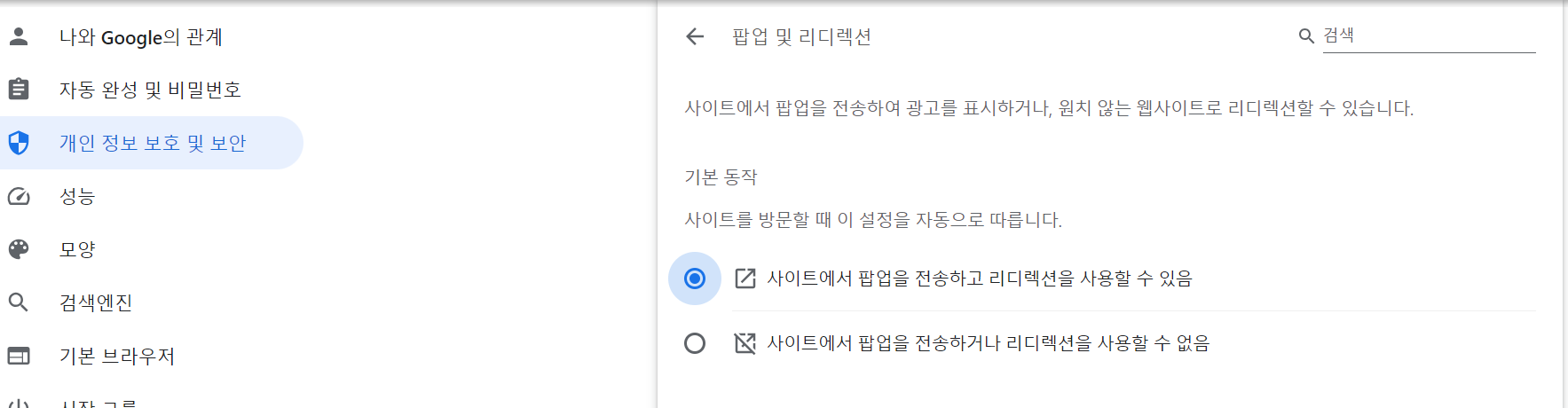 ④ 맨 아래 "팝업 및 리디랙션" 클릭